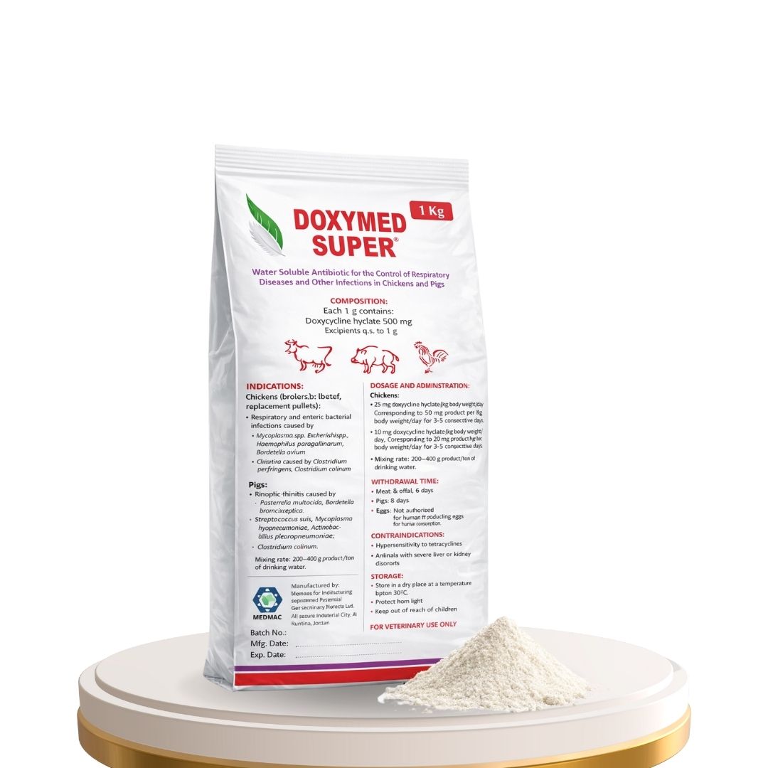 DOXYMED SUPER là kháng sinh phổ rộng thế hệ mới, chứa doxycycline hyclate hàm lượng cao, cho hiệu quả điều trị mạnh trên Mycoplasma, vi khuẩn Gram âm – Gram dương, đặc biệt phù hợp trong các bệnh hô hấp, tiêu hóa và nhiễm trùng kế phát trên heo và gia cầm.
