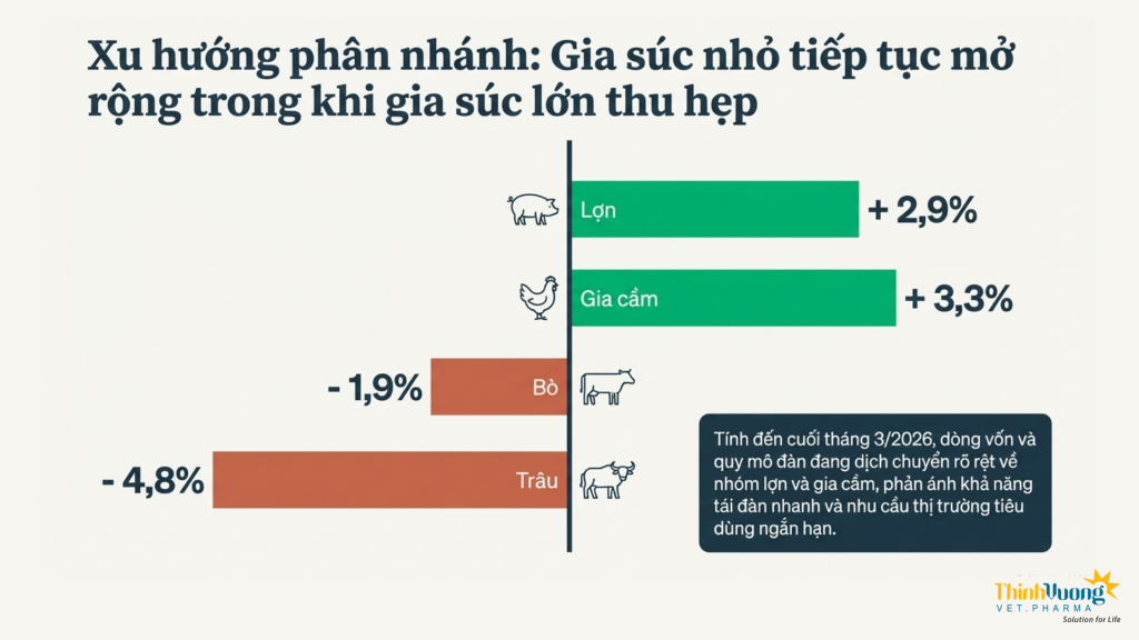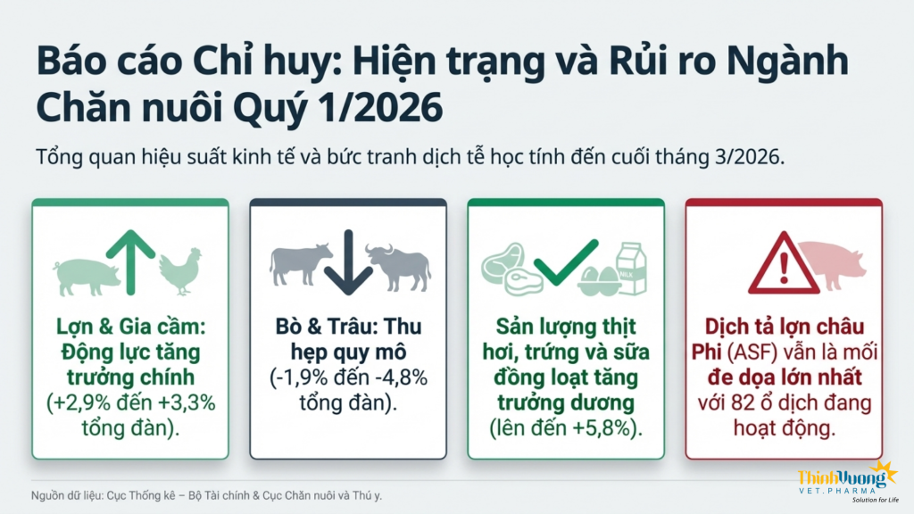 Trong quý I năm 2026, ngành chăn nuôi Việt Nam ghi nhận những tín hiệu phục hồi tương đối rõ nét sau giai đoạn biến động kéo dài, tuy nhiên sự tăng trưởng này diễn ra không đồng đều giữa các nhóm vật nuôi và vẫn chịu tác động đáng kể từ các yếu tố chi phí đầu vào và rủi ro dịch bệnh. Nhìn tổng thể, ngành đang vận động theo hướng tái cơ cấu, trong đó các mô hình chăn nuôi quy mô lớn, chủng ngừa vaccine đầy đủ, kiểm soát tốt an toàn sinh học và liên kết chuỗi tiếp tục chiếm ưu thế.
