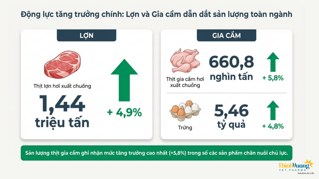Ngành gia cầm tiếp tục là điểm sáng ổn định của toàn ngành khi duy trì được tốc độ tăng trưởng cả về tổng đàn lẫn sản lượng. Nhu cầu tiêu dùng trong nước ổn định, cùng với giá bán không biến động mạnh, đã tạo nền tảng thuận lợi cho người chăn nuôi gia cầm mở rộng sản xuất. Bên cạnh đó, việc áp dụng các mô hình chăn nuôi an toàn sinh học và liên kết chuỗi ngày càng phổ biến đã góp phần nâng cao hiệu quả sản xuất và giảm thiểu rủi ro dịch bệnh. Đây được xem là phân khúc có tính bền vững cao trong bối cảnh thị trường còn nhiều biến động.