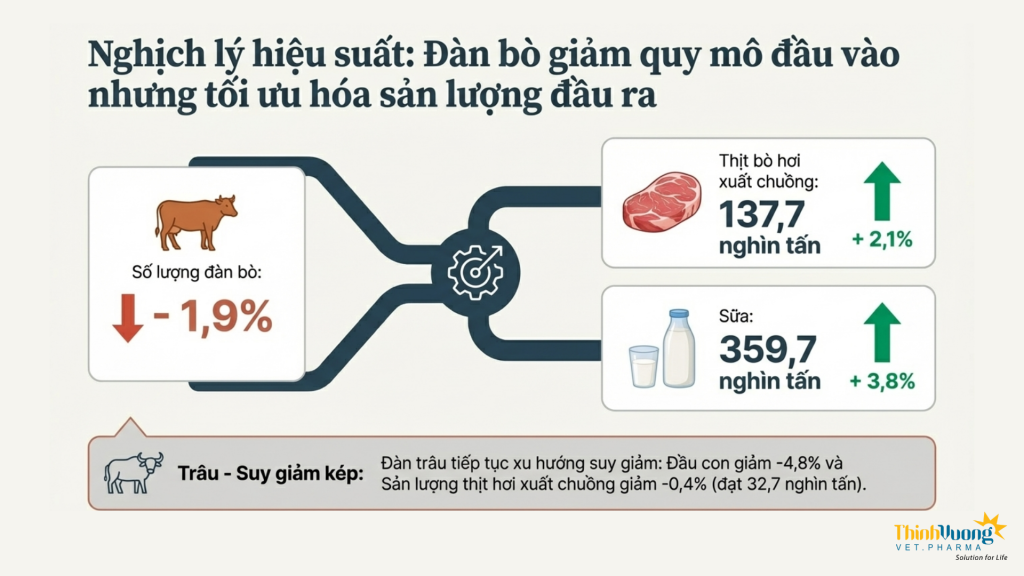 Ngược lại, chăn nuôi trâu, bò vẫn đang gặp nhiều khó khăn và chưa có dấu hiệu phục hồi rõ rệt. Tổng đàn có xu hướng giảm do hiệu quả kinh tế thấp, chu kỳ nuôi dài và chịu ảnh hưởng từ các yếu tố bất lợi như thiên tai và thiếu nguồn thức ăn xanh. Điều này cho thấy sự chuyển dịch cơ cấu trong ngành đang diễn ra, khi người chăn nuôi dần ưu tiên các vật nuôi có vòng quay vốn nhanh và khả năng thích ứng thị trường tốt hơn.