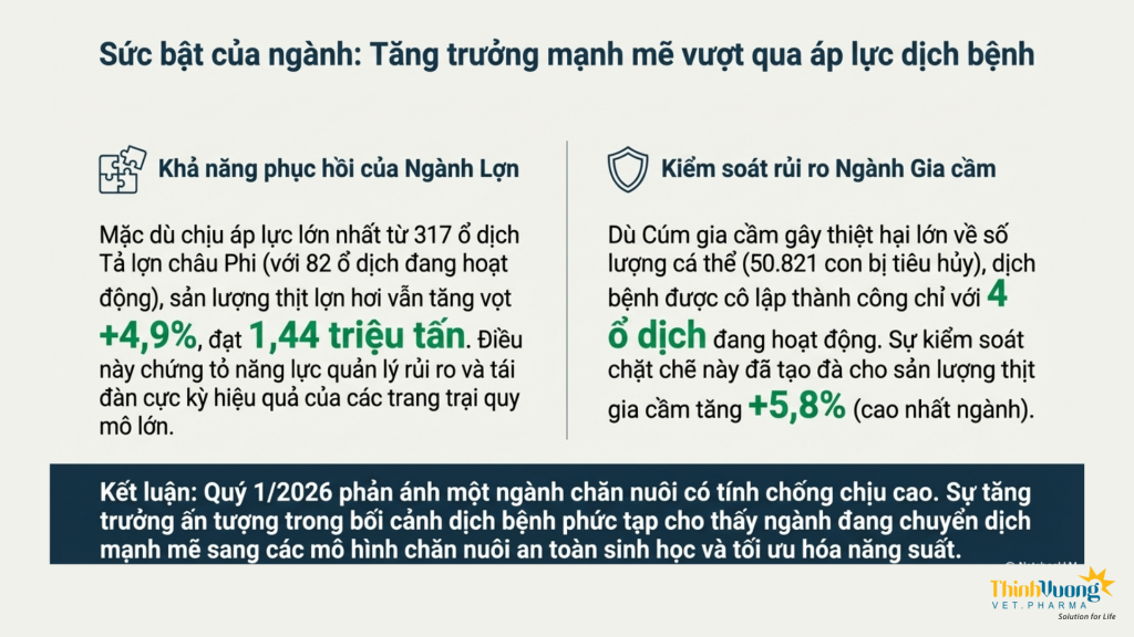 Đối với ngành chăn nuôi lợn, đây là lĩnh vực có mức độ phục hồi tích cực nhất trong giai đoạn đầu năm. Giá lợn hơi duy trì ở mức tương đối ổn định, kết hợp với việc dịch tả lợn châu Phi cơ bản được kiểm soát đã tạo điều kiện thuận lợi cho hoạt động tái đàn. Tổng đàn lợn và sản lượng thịt hơi đều ghi nhận mức tăng so với cùng kỳ năm trước, phản ánh niềm tin của người chăn nuôi đang dần được củng cố. Tuy nhiên, sự phục hồi này chủ yếu tập trung ở các trang trại quy mô vừa và lớn, trong khi các hộ chăn nuôi nhỏ lẻ vẫn đối mặt với nhiều rủi ro về chi phí và dịch bệnh.